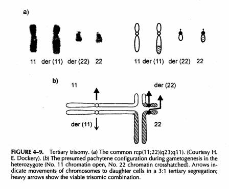 Per la più comune traslocazione bilanciata rcp(11;22)(q23;q11) tutti gli sbilanciati hanno una trisomia terziaria con il der22 in sovrannumero
