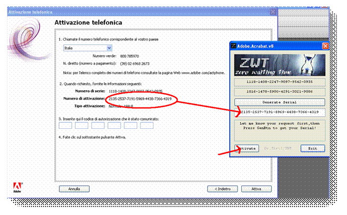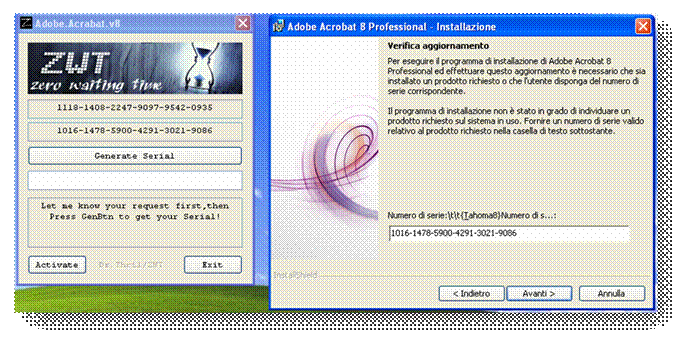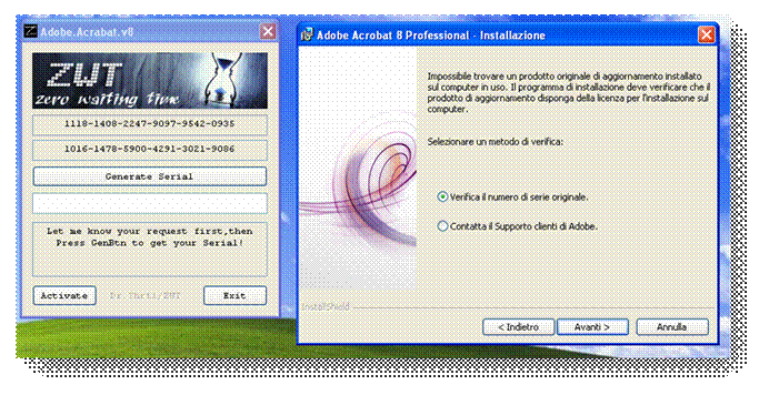 All'interno della cartella Adobe Acrobat pro,c'č il file: Keygen.exe. Aprire il keygen,cliccare su "generate serial" e cominciare la normale procedura d'installazione dal file setup.exe. A differenza delle versioni precedenti casa Adobe adotta il metodo del doppio seriale (giusto per complicarci la vita), inseriamo il primo codice,andiamo avanti e nella finestra successiva inseriamo il secondo codice. Non chiudere il keygen fino all'attivazione completata.