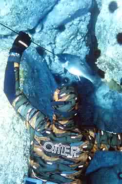 La gioia per la cattura del pescione fu immensa e, forse a causa dell'emozione, andai frettolosamente a fissare la preda al pallone segnasub, probabilmente confidando in qualche altra cattura in quella zonetta. Dopo un'altra buona oretta di tentativi infruttuosi, decisi che forse era preferibile cambiare zona e tornai al gommone, fiero della bellissima cattura effettuata e impaziente di mostrarla al mio compagno di pesca. Purtroppo, giunto al gommone e salpata la sagola del pallone, mi accorsi con rammarico che dello spigolone catturato non v'era più traccia! Evidentemente, poiché avevo fatto passare lo spillone semplicemente dalla branchia alla bocca, complice il moto ondoso la spigola si era sganciata (in effetti con quella enorme bocca c'era da aspettarselo che lo spillo potesse sfilarsi...). I tentativi di ritrovare la preda perduta furono del tutto inutili, ma un insegnamento mi era rimasto dopo quella immensa delusione: mai più avrei assicurato al pallone una preda importante con tanta superficialità. In effetti, da quell'episodio in avanti ho sempre assicurato le mie prede facendo passare lo spillo dalla branchia alla bocca ma facendolo fuoriuscire attraverso la cartilagine del labbro superiore della preda. In questo modo non ho più perso un solo pesce, comprese cernie e ricciole di mole considerevole.