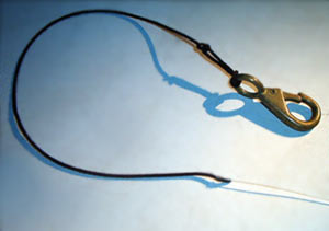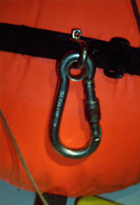 Il nostro galleggiante, abbiamo detto, può rivelarsi molto utile, ad esempio consentendoci di portarci dietro un po' di attrezzature di riserva: attaccato al mio pallone non manca mai un secondo fucile corto, da tana, armato con fiocina, collegato alla boa a mezzo moschettone di sicurezza di generose dimensioni. A questo proposito, credo che sia il caso spendere qualche parola su questo accessorio fondamentale, ossia il moschettone, in quanto che se non curiamo a dovere il collegamento alla boa del secondo fucile, rischiamo di perderlo strada facendo (cosa sicuramente capitata a molti di noi).