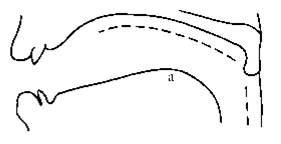 Nella figura 10, la posizione di ogni fono dà il Punto di articolazione, all’interno della bocca, della vocale corrispondente. Lo schema è da leggere come se si trattasse di una sezione sagittale anteroposteriore. In altre parole, il punto in cui è collocato il fono corrisponde (con un certo margine di approssimazione) al punto della cavità orale in cui si trova la parte più alta della lingua. Per la pronuncia di [a] (figura 11)