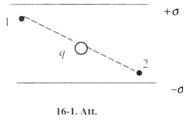 16-48. Aprēķināt lādiņa q = 10 -8 C pārvietosanas darbu no punkta l uz punktu 2 (sk. 16-1. Att.), kas atrodas starp divām paralēlam bezgala lielām platēm ar dazādas zīmes lādiņiem uzlādētām ar lādiņu blīvumu ± σ = 0.4∙10 6 C/m2, kuras atrodas attālumā l =3 cm viena no otras. [13.6∙10 -6 J].