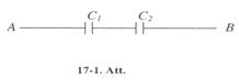 17-44. Potenciālu starpība starp punktiem A un B (sk 17-1. Att.) 6.0 V. Pirmā kondensatora kapacitāte 2 µF, bet otrā 4 µF. Aprēķināt lādiņu un potenciālu starpību uz katra kondensatora platēm. [8∙10 -6 C, 8∙10 -6 C, 4 V, 2V].