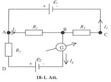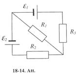 18-61. 18-18. attēla shēmā e e e , R1 = W, R2= W iz un potenciāla kritums pretestībā R2 ir 6 V. Aprēķināt strāvas stiprumu visos ķēdes zaros. Aprēķināt pretestību R3. Elementu ieksējo pretestību neieverot. [0.3 A; 0.5 A; 0.8 A; 7.5 W