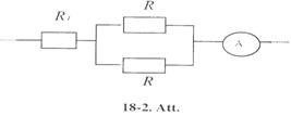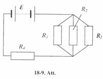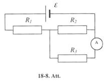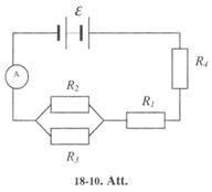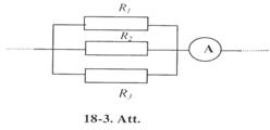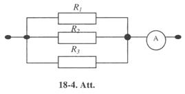 18-8. Aprēķināt potenciāla kritumu pretestības R1, R2 un R3 (18-2. Att.), ja ampērmetrs rāda 3 A; R1 = 4 W, R2 = 2 W un R3 = 4 W Aprēķināt I2 un I3 strāvas stiprumu pretestības R2 un R3. [12 V; 4 V; 4 V; 2 A; l A].