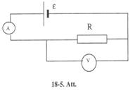 18-33. Pieņemot, ka voltmetra pretestība ir bezgalīgi liela, tiek aprēķināta reostata pretestība R pēc voltmetra un ampērmetra rādījumiem 18-5 attēla shēmā. Noteikt atrastās pretestības relatīvo kļūdu, ja patiesībā voltmetra pretestība ir Rv. Uzdevumu atrisināt, ja Rv = 1000 W un 1) R = 10 W; 2) R = 100 W; 3) R = 1000 W [1) l%; 2) 10%; 3) 100%].