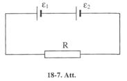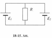 18-35. 18-7 attēla shēmā pretestība R = 0.5 W e un e ir divi elementi ar vienādu 2 V elektrodzinējspēku. So elementu ieksējās pretestības attiecīgi ir r1 = l W un r2 = l .5 W. Aprēķināt potenciālu starpību uz katra elementa spailēm. [4/3 A; 2/3 V; 0].