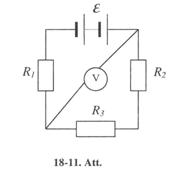 18-42. 18-11. attēla shēmā R1 = R2 = R3 = 200 W. Voltmetrs rāda 100 V; voltmetra pretestība Rv = 1000 W. Aprēķināt baterijas elektrodzinējspēku. Baterijas pretestību neievērot. [170 V].