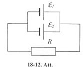 18-44. Divas pretestības R1 = 6 W un R2 = 9 W saslēgtas paralēli un pieslēgtas virknē ar n vienādiem elementiem, kuriem katram ir l .2 V EDS un r = 0.1 W ieksēja pretestība. Ķēde plūst strāva I = 3 A. Aprēķināt elementu skaitu. [12 elementi].