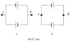 18-50. Divi vienādi sprieguma avoti, kuru EDS ir 1.2 V, bet ieksējās pretestības r = 0.4 W saslēgti, kā parādīts 18-13. Att. a, b. Aprēķināt potenciālu starpību starp punktiem A un B un strāvas stiprumu ķēdē abos gadījumos, [a) 3 A, 0; b) 0; l .2 V].
