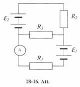 18-55. 18-16. attēla shēmā e 110 V, e = 220 V, R1 = R2= 100 W, R3 = 500 W. Aprēķināt ampērmetra rādījumu. Bateriju un ampērmetra ieksējo pretestību neievērot. [0.4 A].