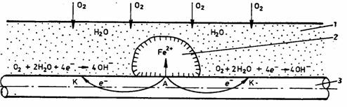 Ka redzams 1.attēla, anodiecirkni izvietoti zem blīvakas grunts daļas (mala). Apakšzemes korozijas procesi noris samēra lēni neitrala vai vaji sarmaina vidē, jo uz anoda uzkrajas grūti šķīstoši produkti ( hidroksīdi, baziskie saļi), kuri izraisa anoda polarizaciju un korozijas stravas ievērojamu samazinašanos. Sevišķi intensīvi apakšzemes korozija notiek skabas gruntīs