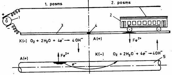 Tramvaja sliežu savienojuma vietas var būt slikts elektriskais kontakts 4, kas rada lielu pretestību elektronu plūsmai. Tadēļ pirms sliežu savienojuma – 1. posma sliedes elektriskais potencials ir negatīvaks par tuvuma esoša cauruļvada potencialu. Līdz ar to sliede ir katods un neitrala vidē pie tas var notikt skabekļa depolarizacija, bet cauruļvads ir anods un uz ta virsmas var notikt dzelzs atomu oksidēšanas :
