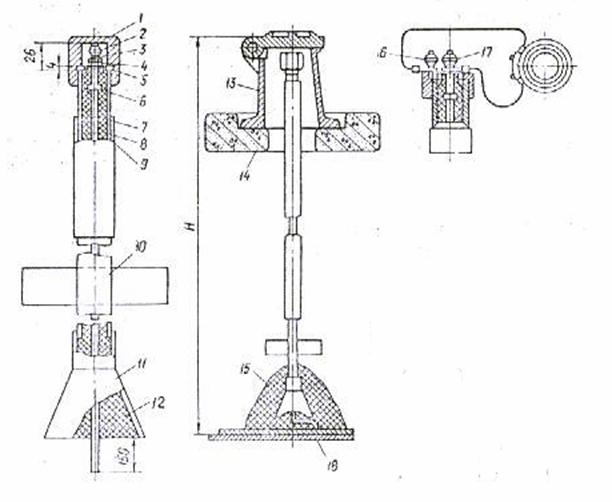 1-vaks ;2-uzgrieznis ;3-paplaksne ; 4-uzgrieznis ; 5-starplika ; 6-tekstolitu ieliktnis ;7-vaditajs ; 8,10 –apvalks ; 9-izolacija ; 11- piltuve ; 12, 15-bitums ; 13-paklajs;