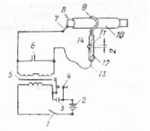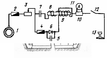 Darbu izolacijas bojajumu noteikšanai veic sekojoša kartība. Aizsargajamam gazes vada galam 8 piestiprina augstspriedzes vadu 7. Elektrisko defektoskopa ķēdi savieno ar izslēdzēju 1. 9. defektoskopa meklētaju liek virs caurules 8 un parvieto gar to. Sliktas izolacijas vietas radīsies dzirksteles
