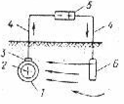 1 – līdzstravas ģenerators, 2 – elektriska transporta vagons, 3 – sliedes,