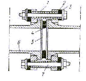 Klejojošo strava panakama ar divflancu savienošanu, kura starp flanciem atrodas izolējošais ieliktnis (Zem katras skrūves un izolējošas paklatnes ir ieslēgtas).