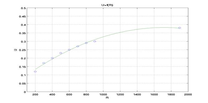 plot(R,U,'o',Rm,Um),grid,axis([100 2000 0 0.5]),title('U=f(R)'),grid,xlabel('R'),ylabel('U')