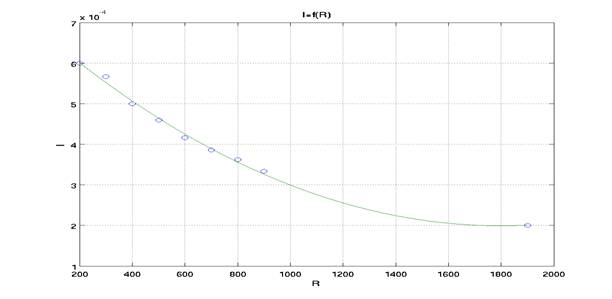 plot(R,I,'o',Rm,Im),title('I=f(R)'),xlabel('R'),ylabel('I'),grid