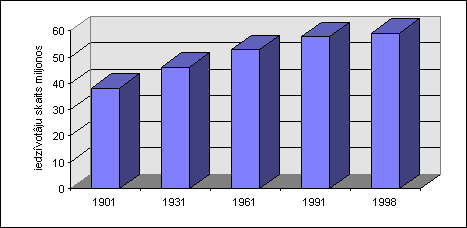 1. tabulā tika apskatīts iedzīvotāju skaits no 1901. līdz 1999. gadam. Tabulā vērojams vienmērīgs pieaugums no 38.2 miljoniem iedzīvotāju 1901. gadā līdz 59.2 miljoniem 1999. gadā. Tas skaidrojams ar dzīves līmeņa paaugstināsanos un augstajām sociālajām garantijām no valdības puses.