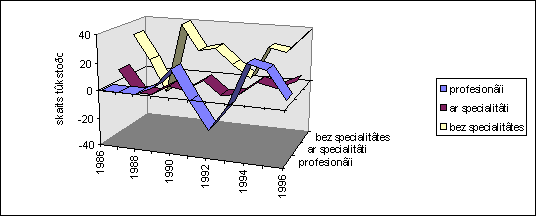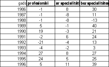3. tabula. Laika posmā no 1986. līdz 1996. gadam izceļojoso un ieceļojoso personu skaits ir mainījies ļoti dinamiski. Starp cilvēkiem ar profesionālu izglītību lielākais izbrauksanas gadījumu skaits ir bijis 1992. gadā (21 tūkstotis).