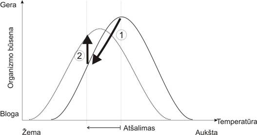 2 pav. Adaptacijos procesas: atsalus orams, kiskio organizmo būsena pablogėja 1; dėl fiziologinės adaptacijos kiskis prisitaiko prie salčio 2 (pagal Lekevičius, 1986).