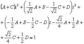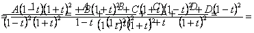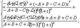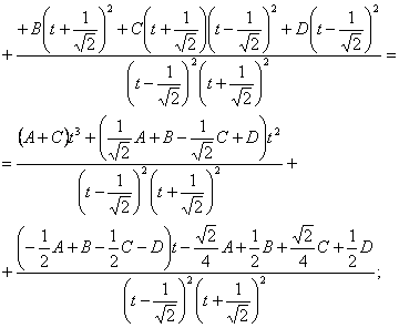 tapatybės (-A+C)t3+(-A+B-C+D)t2+(A+2B-C-2D)t+A+B+C+D rasime neapibrėztus koeficientus A, B, C ir D, sulyginę koeficientus prie vienodų t laipsniu: