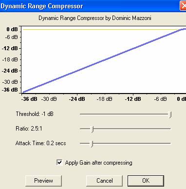 Dinaminis garso diapazono reguliavimas. Tai labai svarbi garso, ypač įrasyto naudojant mikrofoną, apdorojimo funkcija. Kai įrasinėjami ilgesni teksto fragmentai, nepatyręs diktorius negali ilgai skaityti vienodu garsumu, ir garso signale atsiranda labai garsių ir labai tylių vietų. Tokiems įrasams prireikia dinaminio diapazono suspaudimo (pav.11). Dinaminio diapazono reguliavimo operacijos yra sios: