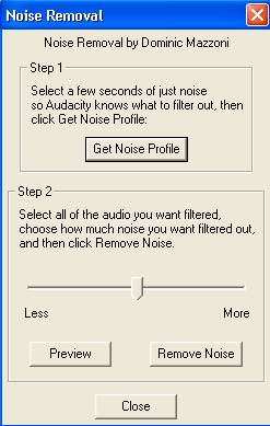 Noise Removal (triuksmo panaikinimas) analizuoja foninį triuksmą ir jį panaikina. Priesingai nei dauguma filtrų, Noise Removal beveik nedaro jokios įtakos tikram garso signalui. Triuksmingame garso įrase reikia surasti vietą, kur nėra reikalingo signalo, ir ją pazymėti - paimti triuksmo fragmentą. Programa isanalizuoja triuksmą, atlieka jo amplitudinę ir dazninę analizę, po to, analizuodama visą garso įrasą, panaikina triuksmui artimas garso dedamąsias.