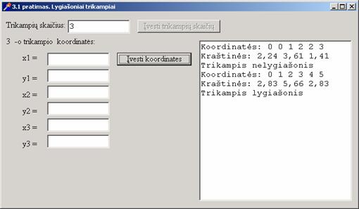 Programoje atskirsime trikampių kiekio (n) ir trikampių koordinačių įvedimą. Naudosime du mygtukus: Button1 ('Įvesti trikampių skaičių') ir Button2 ('Įvesti koordinates'). Pastarąjį reikės spausti tiek kartų, kiek yra trikampių. Programa skaičiuoja, kiek kartų vartotojas nuspaudė Button2 mygtuką ir, įvedus visų n trikampių koordinates, sis mygtukas nustoja reaguoti į pelės paspaudimą. Tai pasiekiama, pakeitus Enabled savybės reiksmę į False