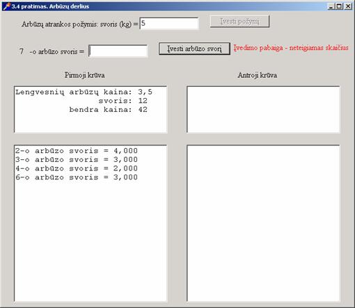 Padarykite 3.5 pratimo programos kopiją ir ją pakeiskite taip, kad nereikėtų įvesti arbūzų kiekio ir svorių įvedimas būtų nutraukiamas įvedus neteigiamą skaičių.