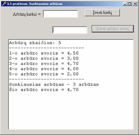 Programoje atskirsime arbūzų kiekio n ir arbūzų svorių įvedimą. Naudosime du mygtukus: Button1 ('Įvesti kiekį') ir Button2 ('Įvesti arbūzo svorį'). Programa nutraukia arbūzų svorių įvedimą įvedus n-o arbūzo svorį. Tai pasiekiama, pakeitus Enabled savybės reiksmę į False