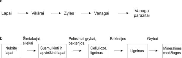 12 pav. Gyvėdzių (a) ir detritinė (b) grandinės (pagal Sylvia S. Mader, 1999 ir Lekevičius, 1991)