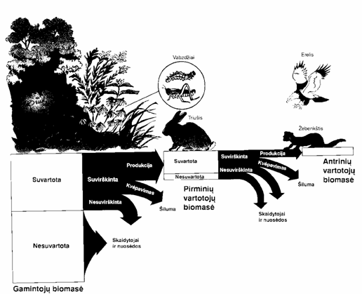 13 pav. Autotrofų asimiliuotos energijos kelias ekosistemoje (modifikuotas pagal Environmental science 3-th edition New-York, 1995)