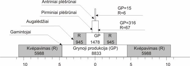 Priklausomai nuo klimato ir kitų abiotinių sąlygų biomasė yra gaminama tam tikru greičiu. Fotosintezės proceso metu yra sukuriama pirminė produkcija. Isskiriamos bendroji ir grynoji pirminė produkcija. Bendroji pirminė produkcija (BPP) - tai Saulės energijos kiekis, asimiliuotas fotosintezės proceso metu ploto vienete per laiko vienetą, kuris paprastai isreiskiamas viename kvadratiniame metre per metus pagaminamos energijos kiekiu (kcal/m2 /m). Grynoji pirminė produkcija (GPP) - tai saulės energijos sankaupos augalinės biomasės (fitomasės) formoje ploto vienete (cm2, m2, ha) per laiko vienetą, atmetus kvėpavimo sąnaudas. Kvėpuodami augalai sunaudoja dalį pačių pagaminto maisto, t.y. bendrosios pirminės produkcijos. Kas lieka yra grynoji pirminė produkcija, kuri naudojama heterotrofų maistui ir kaupiama kaip atsargos. Grynoji pirminė produkcija isreiskiama viename kvadratiniame metre per metus pagaminamos energijos kiekiu (kcal/m2 /m). Tuomet pirminės produkcijos kiekį galima uzrasyti lygtimi |