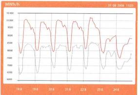 3 pav. Suomijos (elektros importuotojos) energetikos sistemos apkrovos (raudona) ir gamybos (juoda) 2008 m. 34 savaitź grafikai