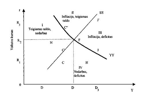 Kita vertus, kreivė YY rodo skirtingus valiutos kurso ir vidinės absorbcijos (D) derinius, kurie veda prie vidinės pusiausvyros nustatymo (t. y. prie santykinai didelio uzimtumo ir tvirtų kainų). Kreivės YY nuolydis neigiamas, nes mazesnės R reiksmės (revalvacijos įtaka) pablogina prekybos balansą, kuris turi būti subalansuotas didinant salies realią vidinę absorbciją (D) tam, kad būtų issaugota vidinė pusiausvyra. Pavyzdziui, jei taską F ant YY kreivės laikysime atskaitos tasku, tai sumazėjus taskui R nuo R2 iki Rl turi padidėti taskas D nuo D2 iki D3, kad būtų issaugota vidinė pusiausvyra (taskas J ant YY). Mazesnis D padidėjimas sukeltų nedarbo didėjimą, didesnis - perteklinę visuminę paklausą ir paklausos infliaciją.