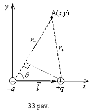 Ploksčiojoje stačiakampėje koordinačių sistemoje dipolio neigiamąjį krūvį sutapdinkime su koordinačių sistemos pradzia, o teigiamasis krūvis tegu bus x asyje, l atstumu nuo koordinačių sistemos pradzios (33 pav.). Dipolio lauką skaičiuosime laisvai pasirinktame taske A(x,y), esančiame toli nuo dipolio, t. y., kai atstumai nuo tasko A iki krūvių q ir +q r ir r+ daug didesni uz dipolio ilgį l: