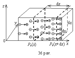 Tegu stačiakampėje koordinačių sistemoje (36 pav.) poliarizuotumo vektoriaus dedamosios yra Px, Py, Pz. Panagrinėkime dielektriko tūrio elementą dV dxdydz. Nepoliarizuotame dielektrike tas tūris buvo neutralus, nes jame nebuvo dipolių (nepoliniame dielektrike) arba tie dipoliai buvo netvarkingai orientuoti. Dielektrikui poliarizuojantis dalis krūvio iseis (arba įeis) per tūrio elemento sieneles. Paprastumo dėlei tarkime, kad juda tik teigiamieji krūviai. Apskaičiuosime,koks krūvis įeis per abi statmenas x asiai sieneles. Per kairiąją sienelę, kurios plotas dydz, įėjęs krūvis lygus qnlxdydz Px(x)dydz, o per desiniąją sienelę isėjęs krūvis lygus atitinkamai Px(x+dx)dydz. Tačiau
