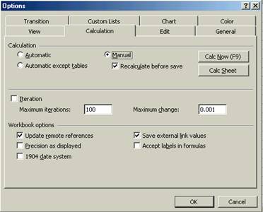 kortelėje Options\ Calculation įjunkite Manual ir Recalculate before