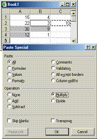 kortelės Paste Special lauke Operation įjunkite Multiply parametrą ir