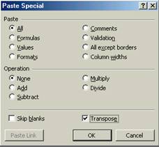 Jeigu norite sukeisti lentelės stulpelius ir eilutes, pazymėkite lentelę ir nukopijuokite į kaupyklę (Ctrl+C), paskui laisvoje Excel lango vietoje pazymėkite pirmojo pakeistos lentelės langelio vietą, suzadinkite komandas Edit ir Paste Special , kortelėje Paste Special įjunkite Transpose ir paspauskite mygtuką OK.