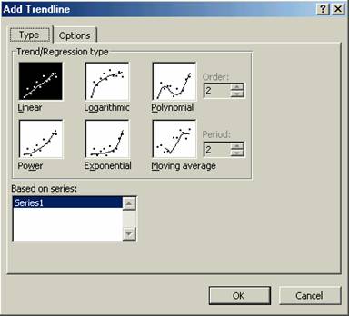 Pele, nuspausdami jos desinįjį klavisą, spragtelėkite diagramoje duomenų sekos atvaizdą ir suzadinkite komandą Add Trendline Kortelės Add Trendline Type isskleidziamajame sąrase Based on series: nurodykite seką, lauke Tend Regression type - aproksimavimo dėsnį. Paspauskite mygtuką Options ir kortelės Add Trendline\Options laukelyje Forward: nurodykite, kelis laiko periodus prognozuoti.