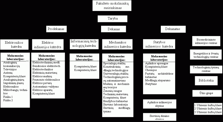 Siuo metu Technologijos fakultete yra 5 katedros. Tai elektros inzinerijos, elektronikos, informacinių technologij 18218l1119s 71;, mechanikos inzinerijos ir statybos inzinerijos. Joms vadovauja doc. T. Simkevičius, doc. G. Daunys, doc. M. Bernotas, lekt. Z. Ramonas ir doc. M. Peliksa. Statybos inzinerijos katedra įkurta 2004 m. pradzioje. Ji isaugo is statybos inzinerijos skyriaus, veikusio mechaninės technologijos katedroje. Pastaroji katedra pakeitė savo pavadinimą į mechanikos inzinerijos. Mechanikos inzinerijos katedroje veikia siuvinių dizaino skyrius, kuriam vadovauja asistentė R. Klevaitytė, o statybos inzinerios katedroje įkurtas aplinkos inzinerijos skyrius, kuriam vadovauja asistentas R. Virsilas. Į fakulteto dekanato sudėtį įeina fakulteto tarybos pirmininkas prof. V. Tričys, dekanas prof. V. Lauruska, prodekanas S. Rimovskis, dekano padėjėjas doc. L.Buivis, minėtų katedrų vedėjai, referentė O. Kisielienė bei studentų atstovybės narys. Fakultete yra ūkio grupė, kuriai vadovauja rūmų valdytojas J. Kazlauskas. Fakultetas taip pat turi biblioteką. Fakulteto adresas - Vilniaus 141. Fakulteto struktūra pateikta 1 paveiksle.