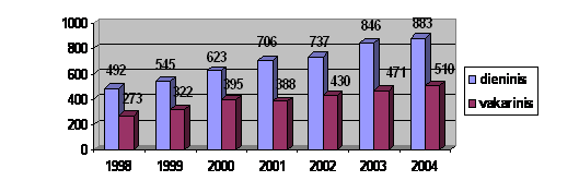 Studentų skaičiaus kitimas per pastaruosius metus pateiktas 3 paveiksle. Dieninio skyriaus studentų skaičiaus augimas apsprendziamas naujų studijų programų įvedimu bei studentų priėmimo skaičiaus didinimu, na, o vakarinio - dirbančio jaunimo susidomėjimu studijomis. Palyginimui 4 ir 5 paveiksluose pateikiami dieniniame ir vakariniame skyriuje studijuojančių studentų skaičiaus kitimas bei mokančių uz studijas studentų skaičiaus kitimas. Dieniniame skyriuje mokantys uz studijas, tai mokantys dalinę studijų įmką, mokantys senato nustatytą įmoką bei nenuosekliųjų studijų klausytojai.
