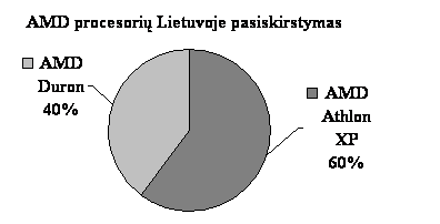 Pasak A.Naujoko, Lietuvos rinkoje dabar populiariausi yra "AMD Duron 1200" ir "AMD Athlon XP 1600+" procesoriai. Dabar apie 60 procentų parduotų procesorių yra "AMD Athlon XP", o apie 40 procentų yra "Duron". Sis santykis turi tendenciją keistis "AMD Athlon XP" procesorių naudai, nors dar 2002 metų pradzioje buvo parduodama daugiau "Duron" procesorių. Įdomu, kad pasaulyje AMD uzima tik apie 16,5 procentus rinkos, tad Lietuva siuo atzvilgiu yra isimtis. Vaizdziai tai matyti zemiau pateikiamame grafike.