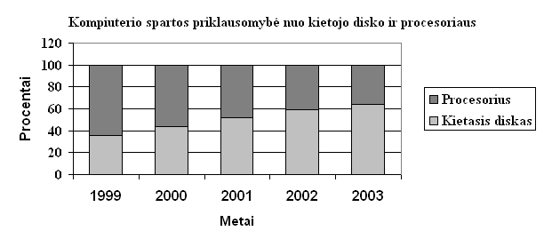 Issirinkus procesoriaus tipą ir seimą (pavyzdziui, "Intel Celeron" arba "AMD Duron") jums dar reikia pasirinkti jo daznį. Čia jau galioja taisyklė, kad kuo didesnis daznis, tuo yra geriau. Bet atrodo, kad ateityje kompiuterio bendrajai spartai procesoriaus daznis turės mazesnę įtaką nei dabar. Įvairios kompiuterio sudedamosios dalys vystosi nevienodai greitai. Lėčiausiai besivystanti dalis yra kietieji diskai. Jei tokia padėtis nesikeis, tai po poros metų yra labai tikėtina, kad svarbiausiu kompiuterio spartą nusakančiu kriterijumi taps kietojo disko sukimosi daznis ir duomenų kanalo pralaidumas. Kad tokios kalbos yra gana pagrįstos galima įsitikinti atidziau panagrinėjus zemiau pateikiamą grafiką. Kuo toliau, tuo labiau kompiuterio sparta priklauso nuo kietojo disko.Grafike pavaizduota, kaip kompiuterio atsaką į uzklausas įtakoja procesorius ir kietasis diskas.
