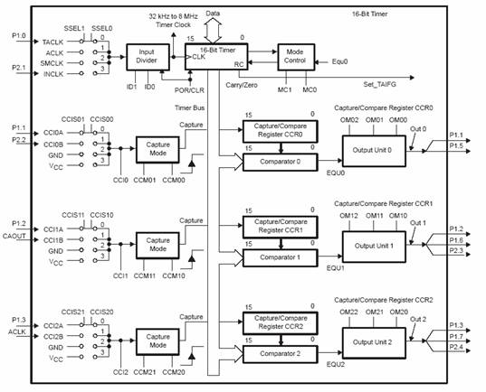 Vienas is vidinių mikrovaldiklio modulių yra laikmatis Taimeris A. Sį laikmatį sudaro 16 bitų skaitiklis ir trys fiksavimo - palyginimo registrai. Taktinių impulsų saltiniu Taimeriui A gali būti vidinis (signalai ACLK ar SMCLK) arba isorinis (signalai TACLK arba INCLK). Taktinių impulsų daznį galima sumazinti du, keturis arba astuonis kartus.