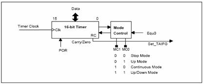 Istisinis rezimas. Taimeris skaičiuoja nuo 0 iki maksimalios reiksmės 0FFFFh. Pasiekęs maksimalią ribą, taimeris perkraunamas ir veiksmai atliekami is naujo. Vėliavėlė pertraukimo TAIFG nustatoma, kai taimeris skaičiuoja nuo 0FFFFh iki 0. TAIFG nustatoma nepriklausomai ar pertraukimo leidimo bitas yra nustatytas.