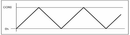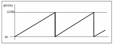 Didėjimo rezimas. Taimeris skaičiuoja iki konkrečios reiksmės, kuri yra fiksavimo ir palyginimo registre CCR0. Reiksmė esanti registre CCR0, neturi būti lygi 0FFFFh reiksmei. Taimeris skaičiuoja nuo konkrečios reiksmės esančios taimerio registre. Kada 16 bitų taimerio reiksmė pasidaro lygi fiksavimo ir palyginimo registrui CCR0, 16 bitų taimeris perkraunamas ir skaičiavimai atliekami is naujo (35 pav.).